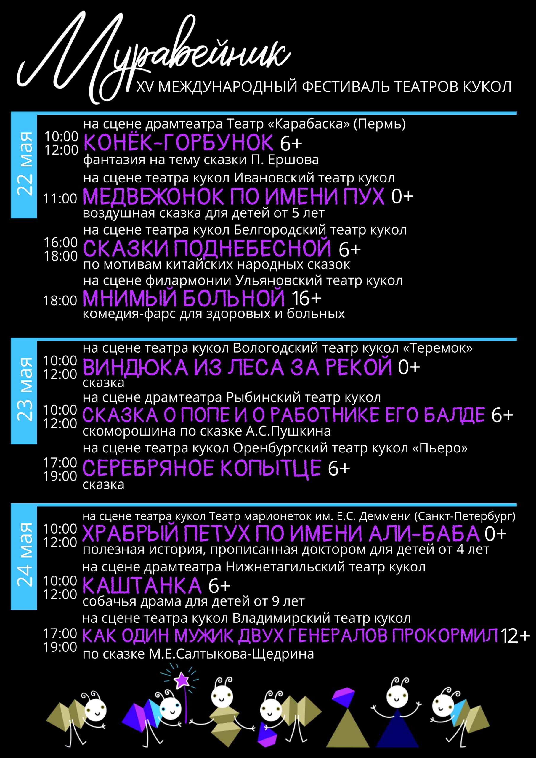 XV Международный фестиваль театров кукол «Муравейник» пройдёт с 22 по 26 мая! Зрителей ждут шестнадцать спектаклей на сценах Ивановского театра кукол, Ивановского драматического театра и Ивановской государственной филармонии.